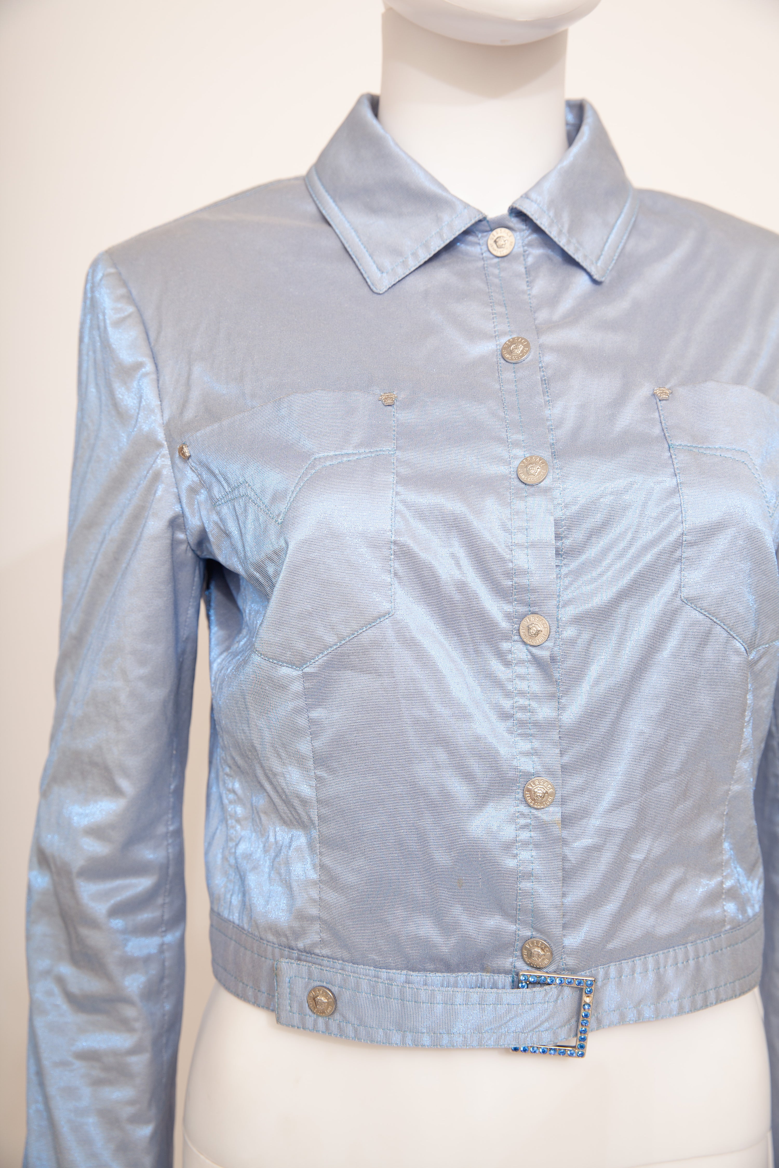 Versace Satin Shiny Blue Vintage Jacket Diamanté Blue Buckle